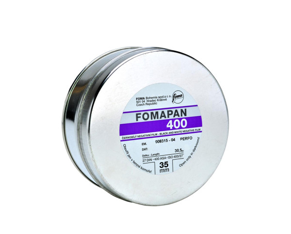 30 MTS Fomapan 400 es un negativo en blanco y negro pancromáticamente sensibilizado de la sensibilidad nominal ISO 400/27° que cumple con los altos requisitos de baja granulosidad. La película está destinada para fotografiar bajo condiciones desfavorables de luminosidad o para el uso de menores tiempos de exposición. Fomapan 400 se produce en rollos perforados de 35mm, en rollos tipo 120 o en metraje. Lata / Bobina de 30 metros para 35 mm.