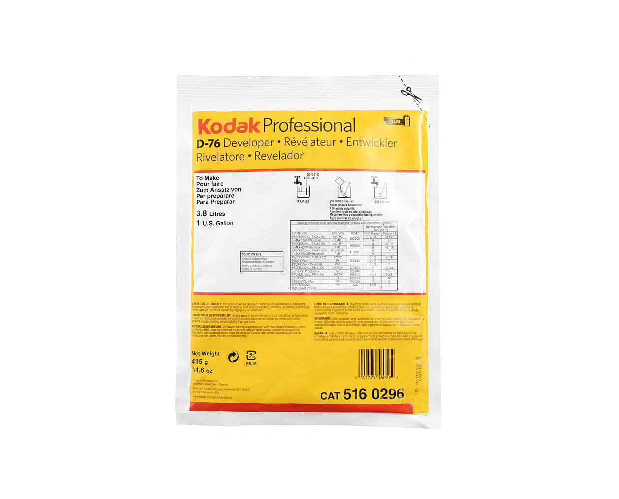 Kodak D76 es un revelador de polvo clásico para negativos en blanco y negro. El D76 ofrece un excelente rendimiento de velocidad y ricos detalles en las sombras con un contraste normal. Se distingue por su grano fino y su excelente latitud de exposición. D76 es adecuado para el revelado normal o push
